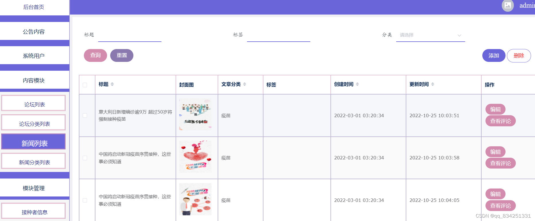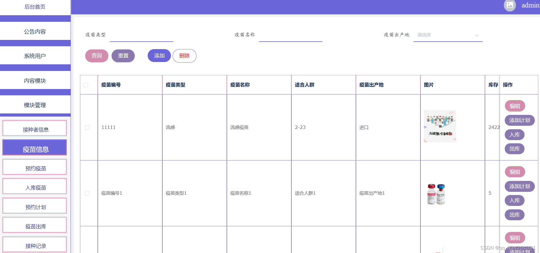 3.疫苗信息管理:对疫苗信息进行维护,添加、删除、修改信息。