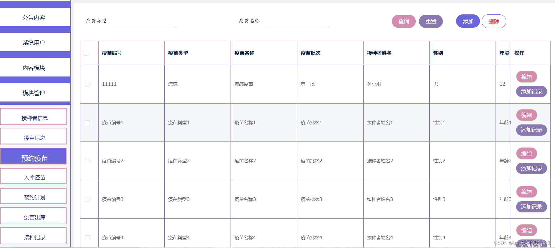 4.接种者信息管理:对接种者信息进行维护,添加、删除、修改信息。