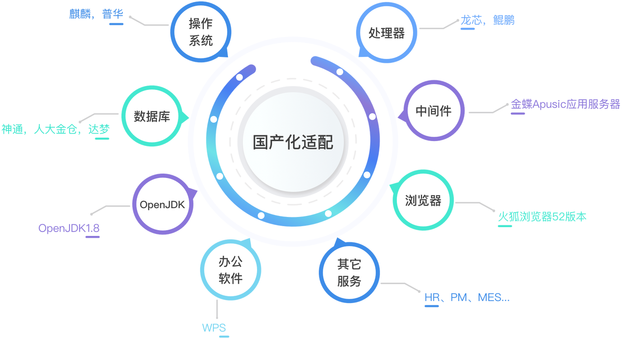 提供完备的国产化软硬件部署方案,对国产芯片、操作系统、中间件、数据库、办公软件无缝兼容。