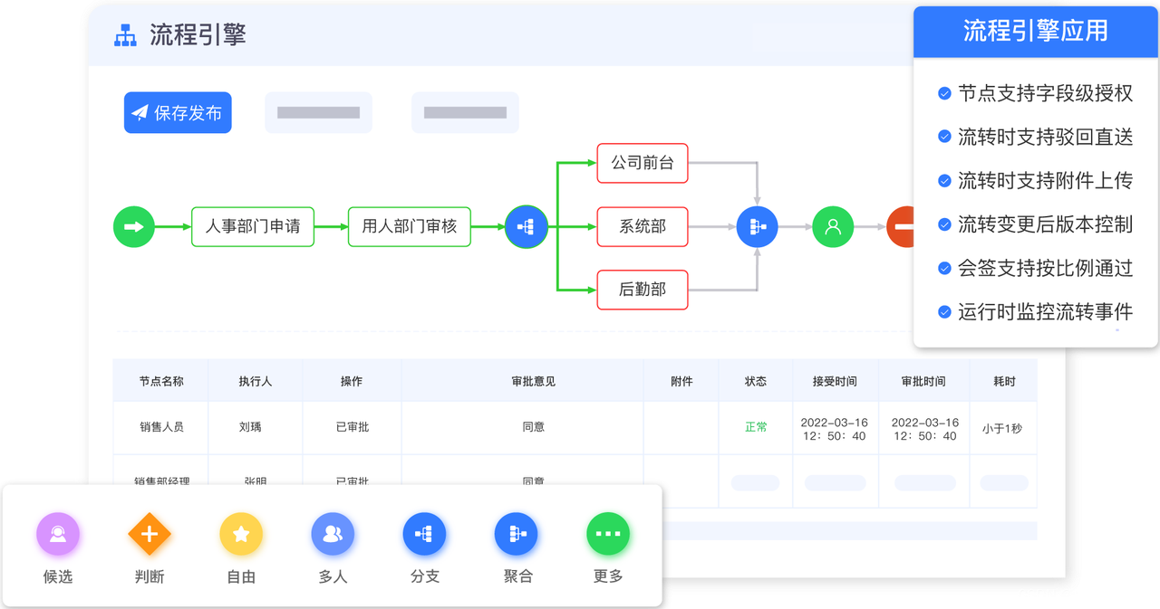 支持退回、驳回、加签、传阅、会签、判断、分支、多人审批等特殊逻辑。