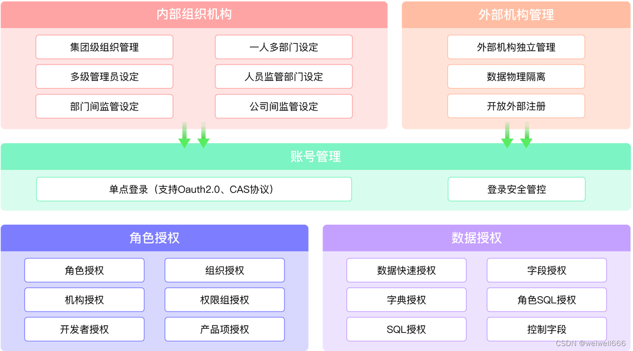 JECLoud微服务低代码平台快速开发平台统一管理内外部组织体系,支持管理大型集团组织,支持接入组织外部用户,可打通企业微信、钉钉、飞书、华为WeLink、内置单点登录(支持 Oauth2.0、CAS协议)集成。