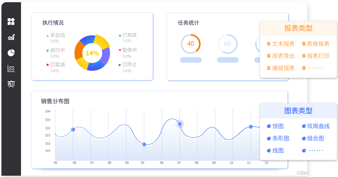 拥有分组报表、交叉报表、填报报表、饼图、柱图、雷达图、条形图、散点图等多种可视化数据分析工具。