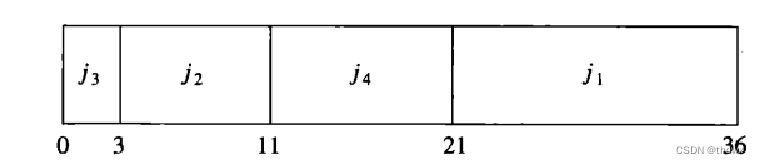 为同序时,也就是花费时间少的作业,处理的顺序也应该靠前,这样就能使第二项达到最大,从而使总时间达到最小。所以最优调度方案如图: