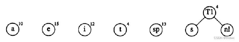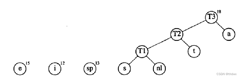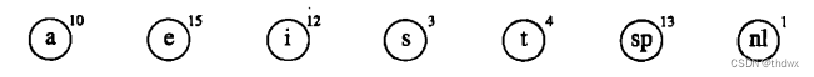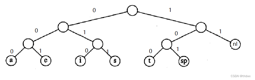 假设有一个文件,包含字符a、e、i、s、t,再加上一些空格和换行,并且有10个a、15个e、12个i、3个s、4个t、13个空格和1个换行,如图所示,这个文件就需要174位来表示: