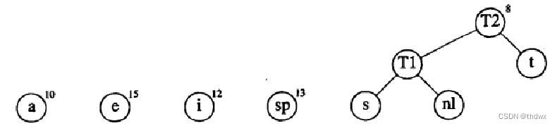 由Huffman算法生成的树就叫作Huffman树,得到的编码就是Huffman编码。Huffman算法的基本思想就是:对于一个文件中出现的所有字符,首先将其建立为一个森林,每个节点都存放字符本身以及字符出现的频率,然后选择其中频率最小的两个节点合并为一棵树,这棵树的频率为合并的两个节点频率树之和,然后将合并后的树放回森林,再找到两个频率最小的节点重复上述工作,直到最后只剩一棵树,就完成了Huffman编码。对于上述文件,建立Huffman树的具体过程如下: