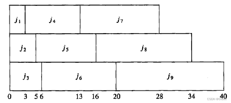 将问题推广到多处理器,假设有9份作业和3个处理器,那么最优调度方案其实与单处理器相似,只需要将9份作业从小到大排序,依次交由三个处理器处理即可(即使作业的份数不能整除处理器的个数,最优解依然是存在的):