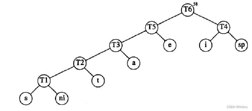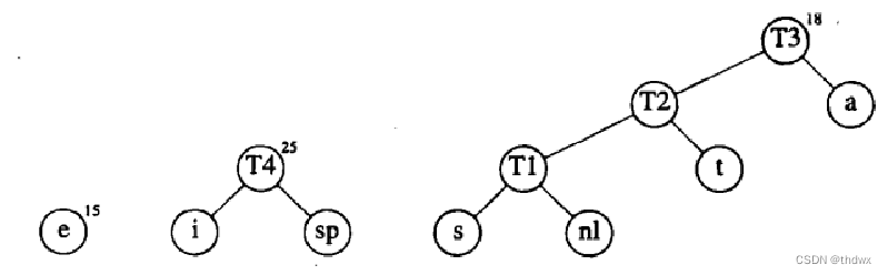 Huffman树一定是一棵满树,因为如果不是满树,就一定存在一个只有一个孩子的节点,那么在合并时,就一定是只将森林中的一个节点与一个NULL进行合并,这与我们的操作过程是不符的;频率最小的节点一定是最深的,由数学归纳法知,在第一次合并时,显然结论是成立的。假设在T3次合并时结论也成立,那么在T5次合并时,如果e的频率小于T3的频率 ,并且e的频率要小于a或是T2的频率,那么在T3合并时,就会先将e进行合并,所以e的频率一定是大于比它更深的节点的。这样就可以使出现次数最多的字符的编码值是最短的,得到的编码就是最优的。