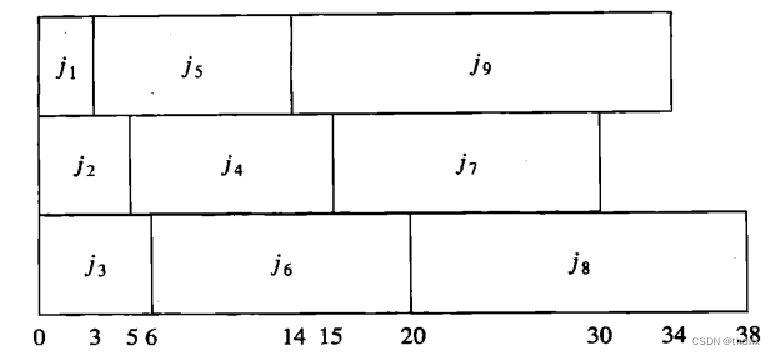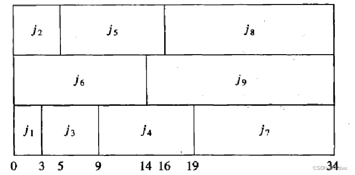 但多个处理器在平均时间最优的情况下会有一个最终结束时间问题,如果交换7,8,9三份作业的位置,如下图: