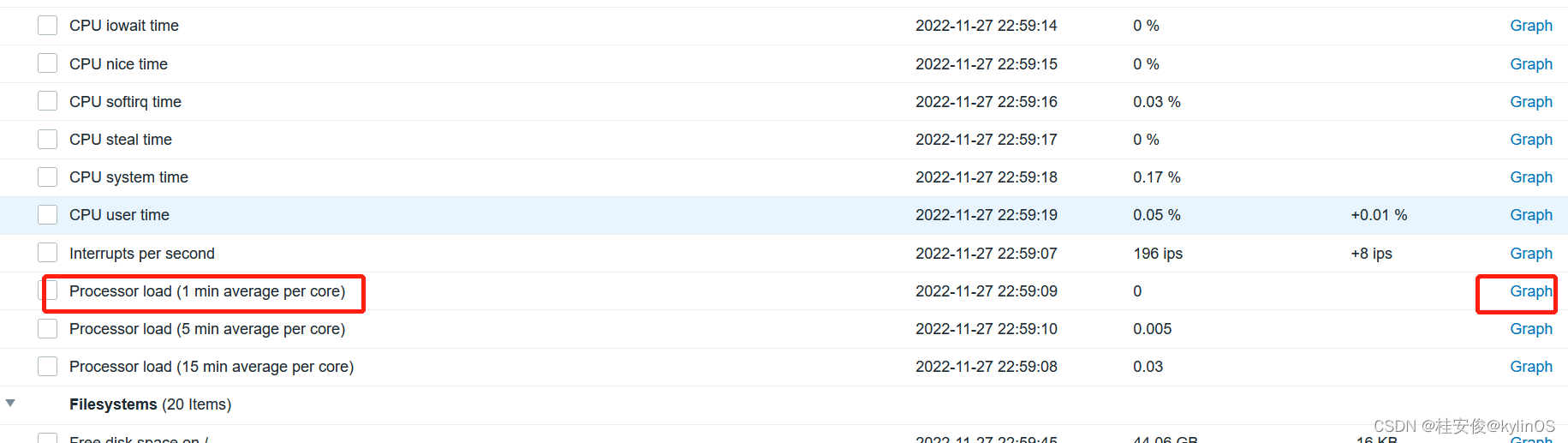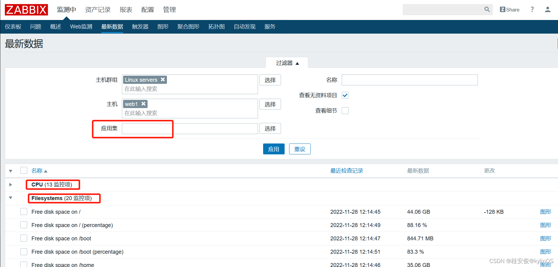 如下图,在查看监控项的时候,下面的CPU、Filesystems黑色加粗项就是一个个应用集,应用集里面包含了同一类的若干具体监控项: