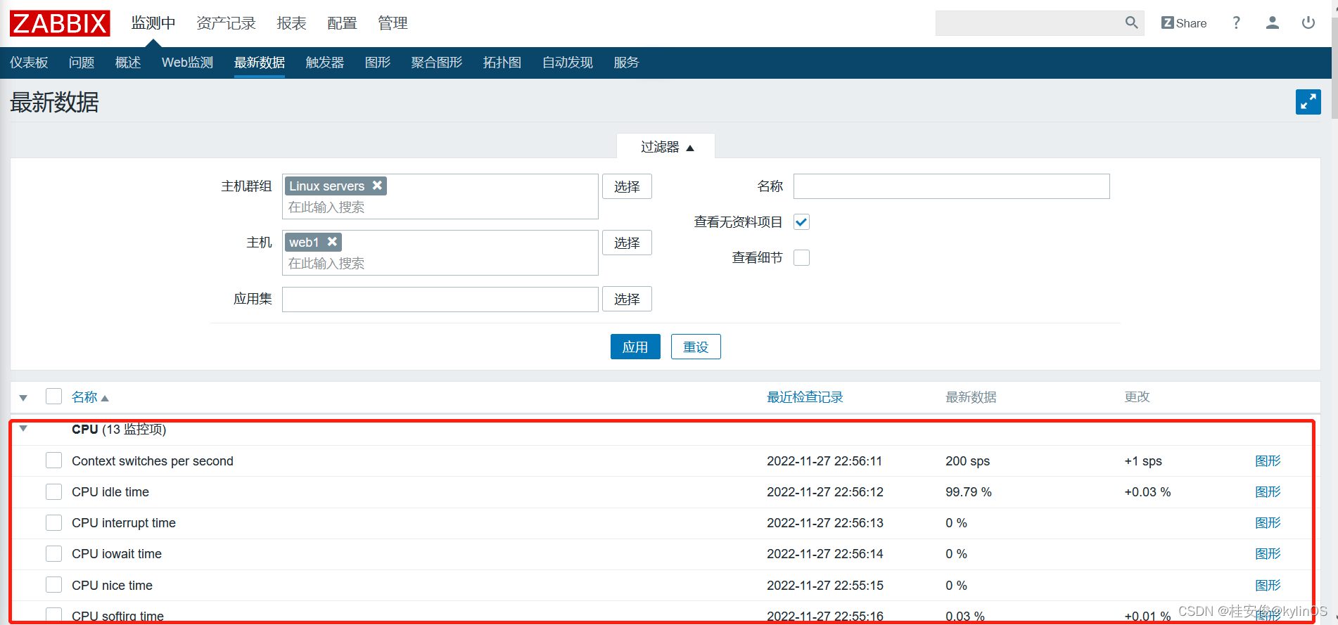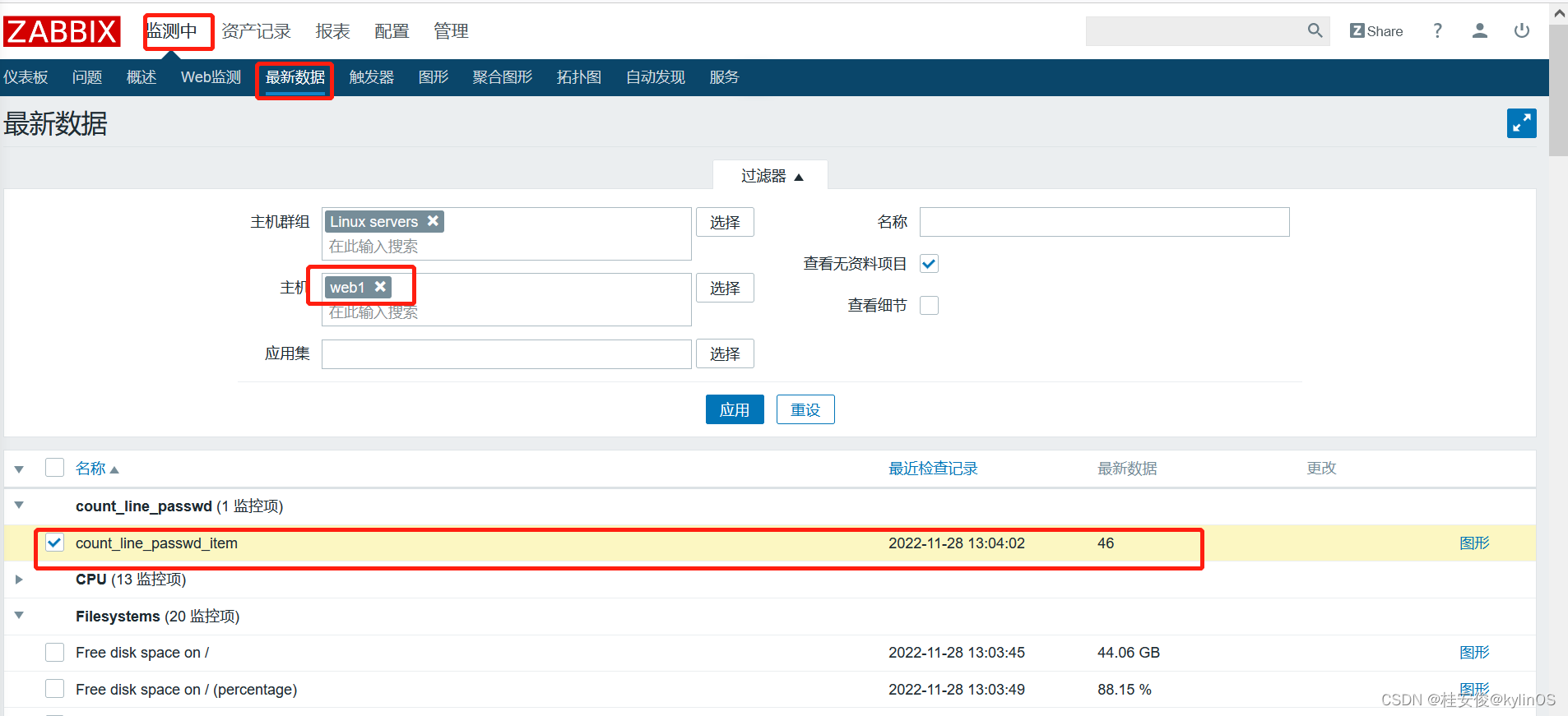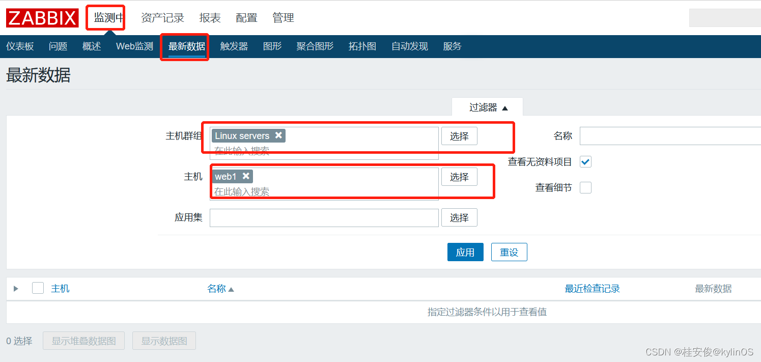 选择“监测中”--->“最新数据”--->选择主机,如果主机比较多,可以先选择“主机群组”,然后在群组里找到指定主机,选择完后点“应用”: