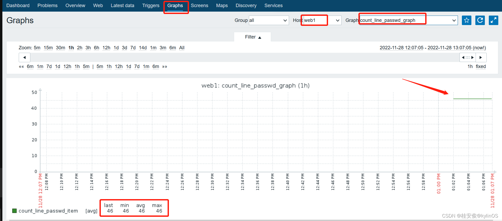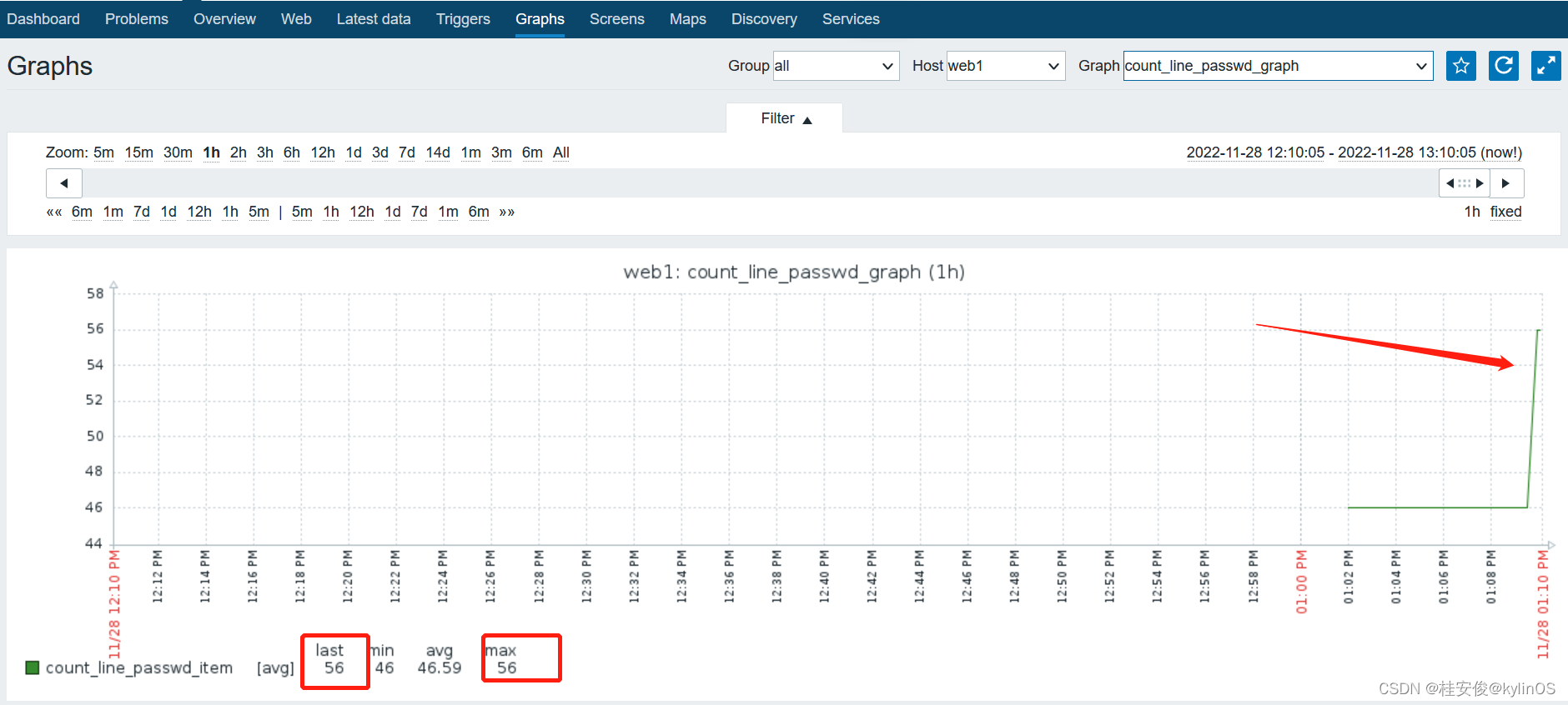 以上配置好自定义监控内容后,可以实现查看自定义监控数据了,可以看到监控web1的count_line_passwd_item的值,即实时用户数: