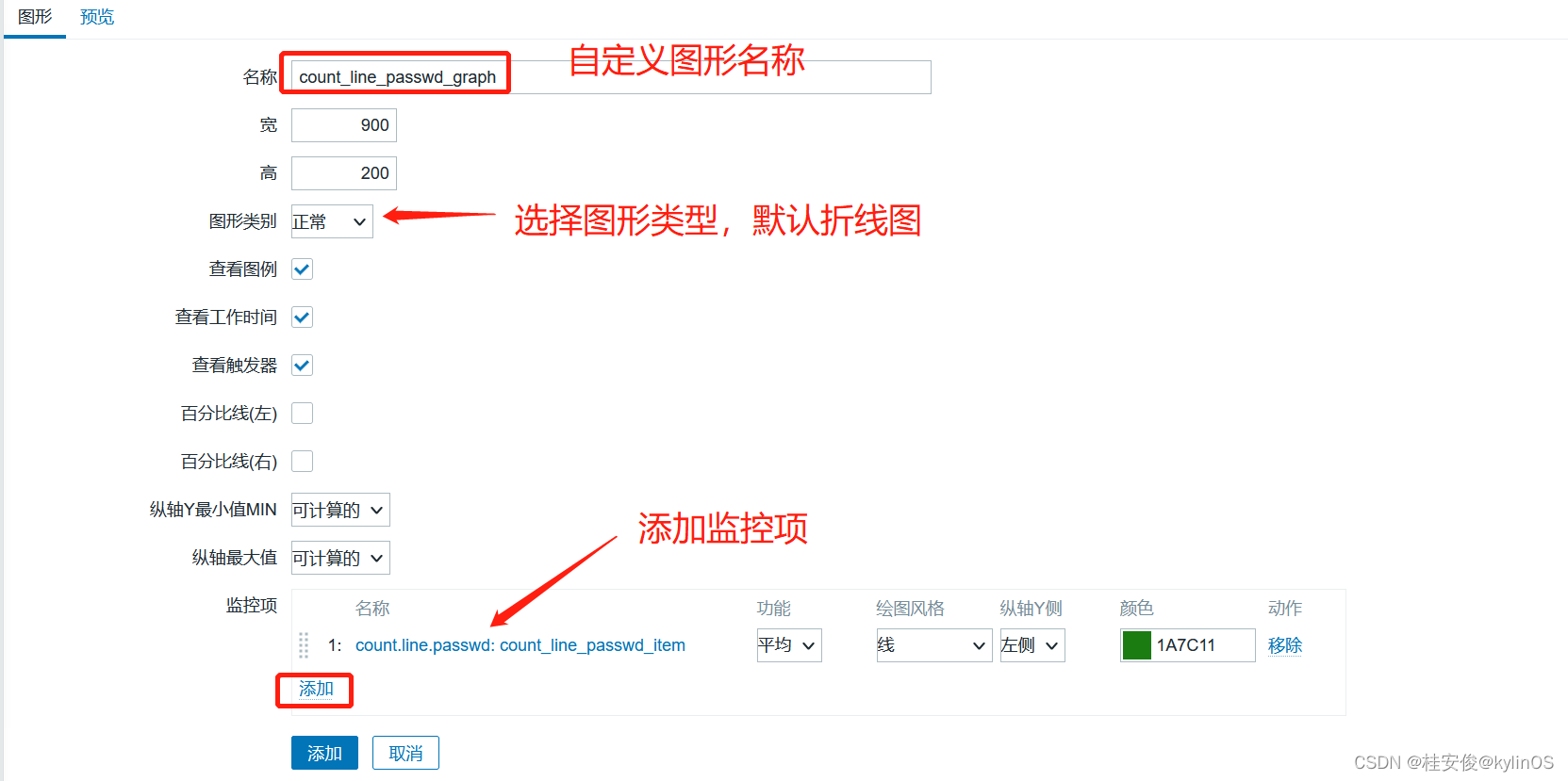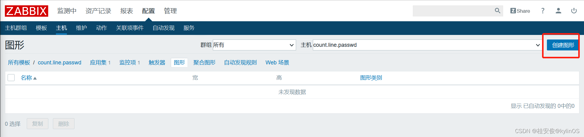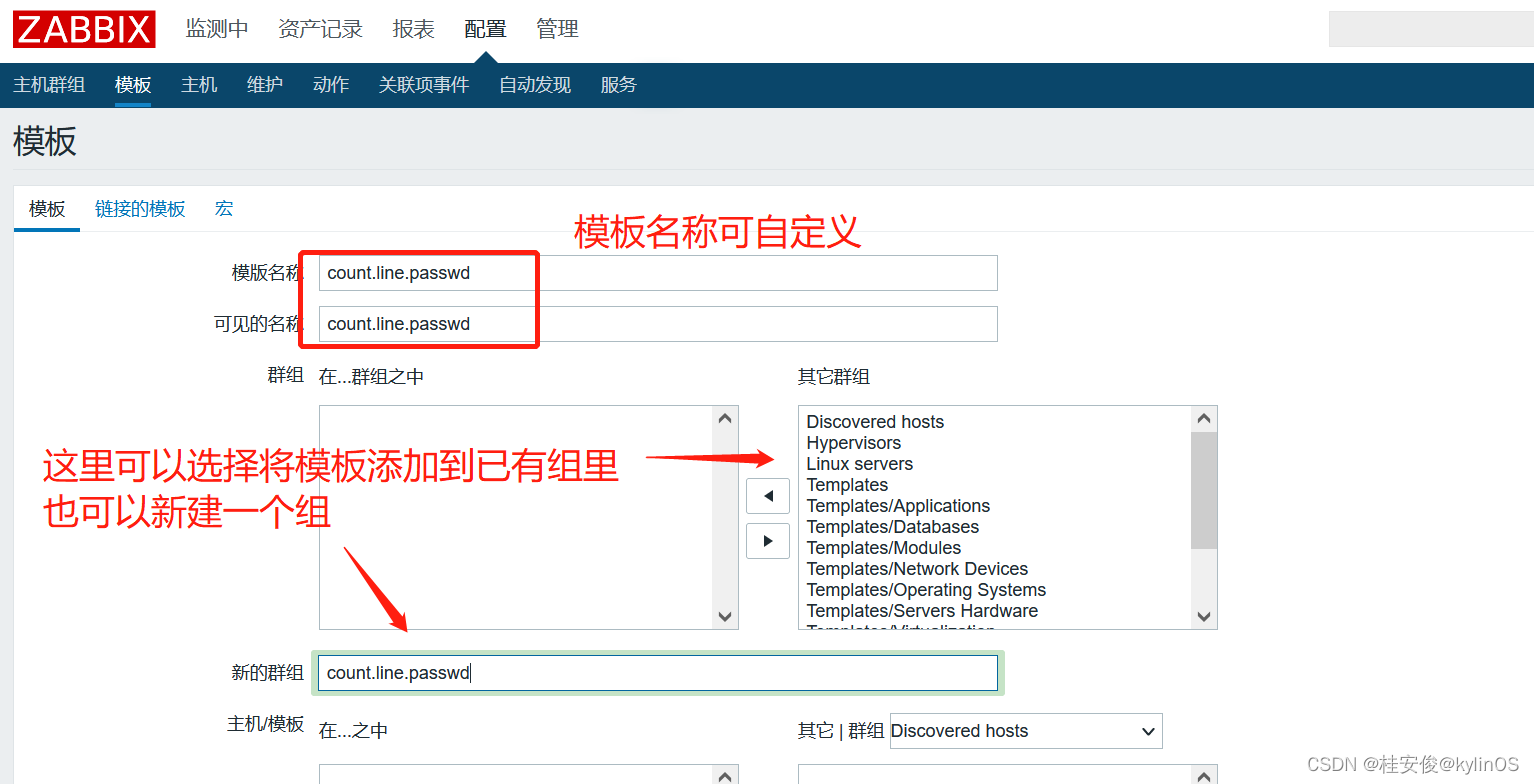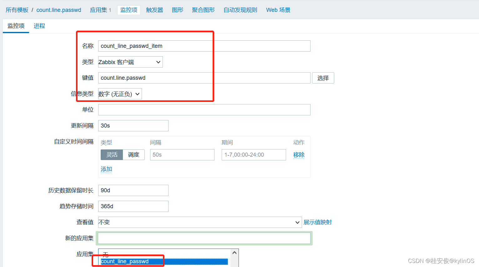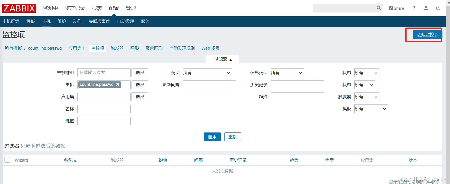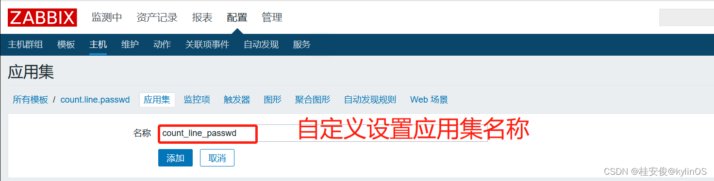 如上,这里创建一个count.line.passwd监控模板,然后放到一个新建组count.line.passwd里,完成之后选择最下面的添加。