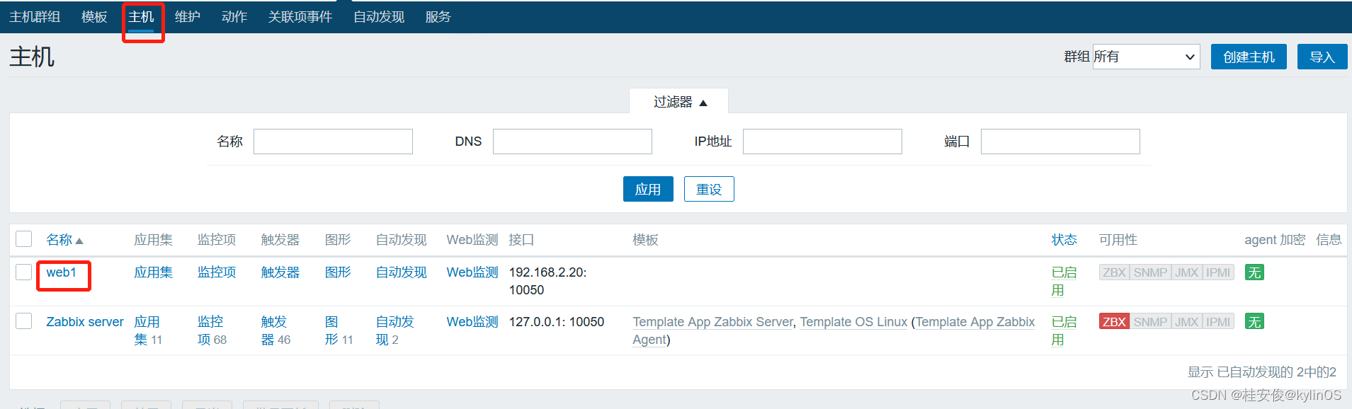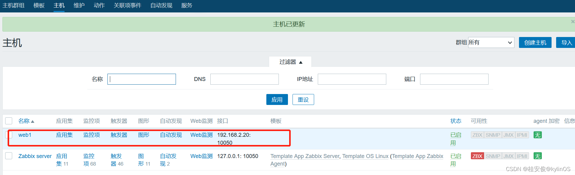 如下可以看到添加的web1监控主机,但是监控项是0项,这里只是添加了主机,还没有设置监控项: