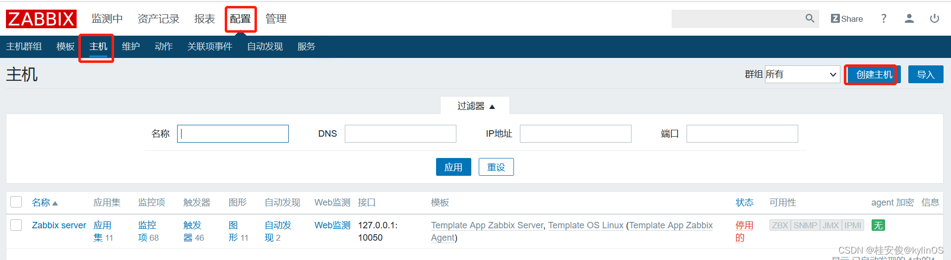 下面自带的一个监控记录是zabixserver自己监控自己,但是服务没有启用,点击状态可以切换启用。