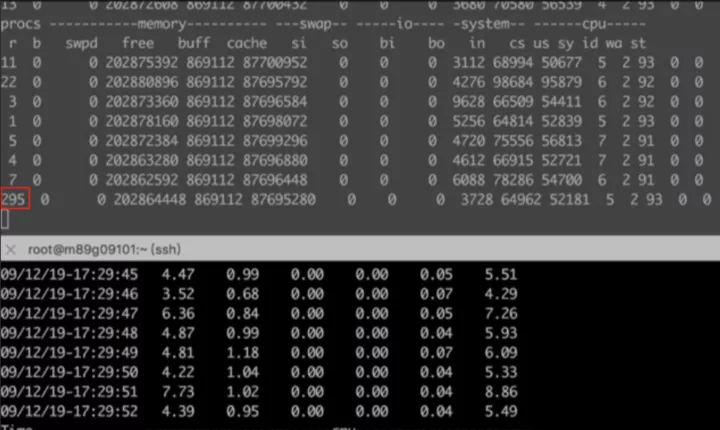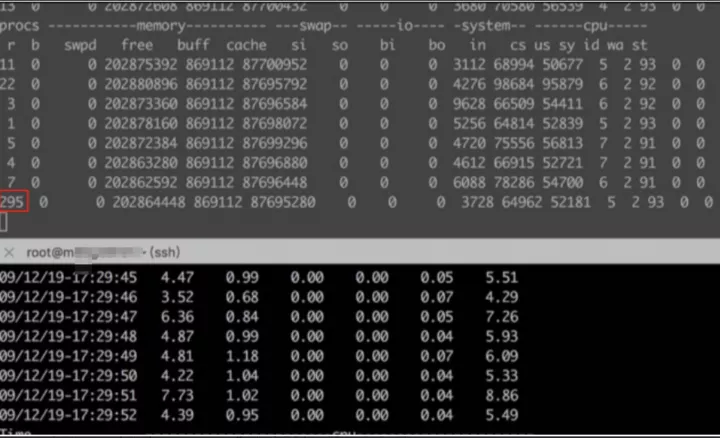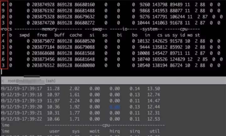 再看看调整前压测的时候的vmstat和tsar --cpu,可以看到process running抖动明显