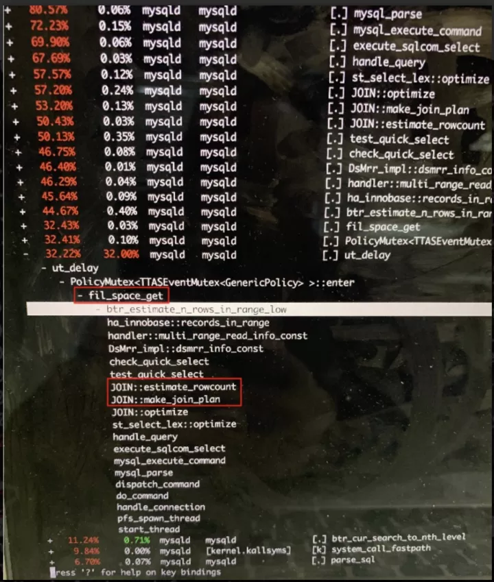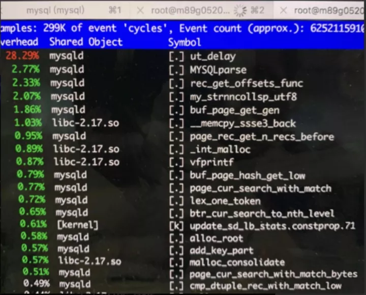 直接用 perf 看下 MySQLD 进程,发现 ut_delay 高得不符合逻辑: