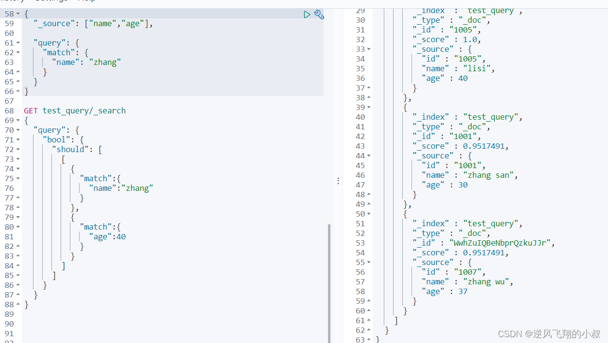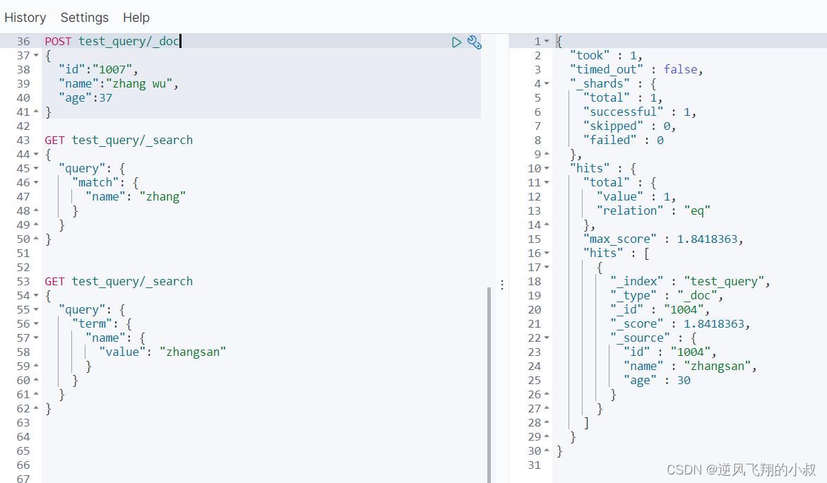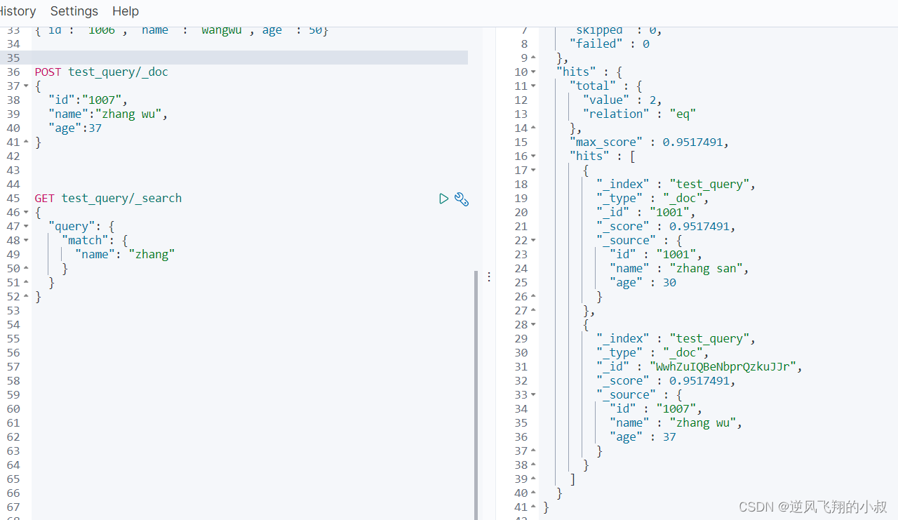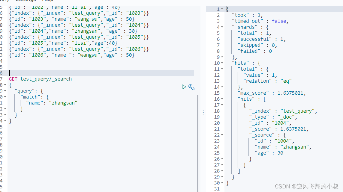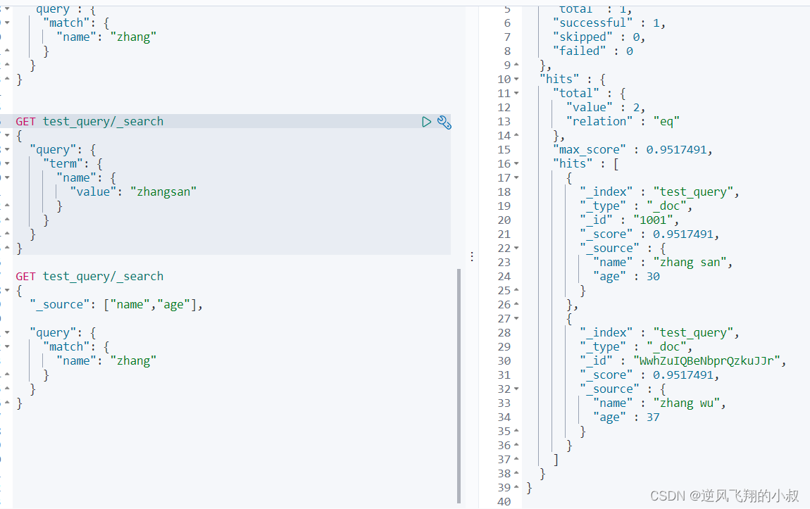 再次使用 zhang 这个关键词进行name字段查询时,可以看到下面的效果,简而言之:使用match查询时会带有分词效果;