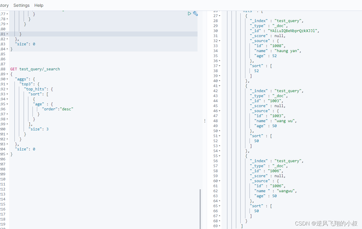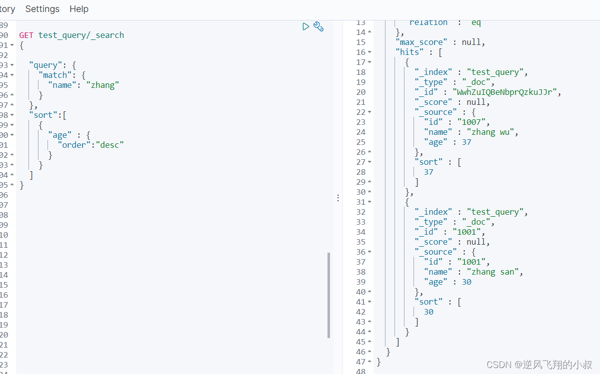 {"query": {"match": {"name": "zhang"}},"sort":[{"age" : {"order":"desc"}}]