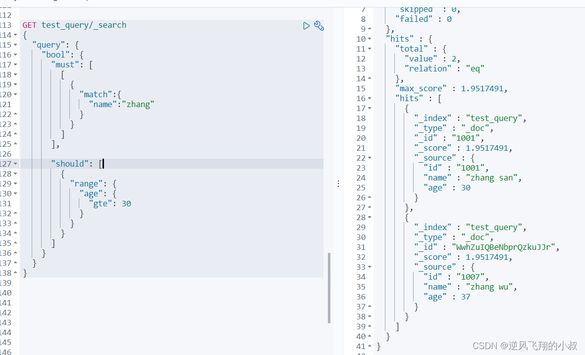 {"query": {"bool": {"must": [[{"match":{"name":"zhang"}}]],"should": [{"range": {"age": {"gte": 30}}}]}}