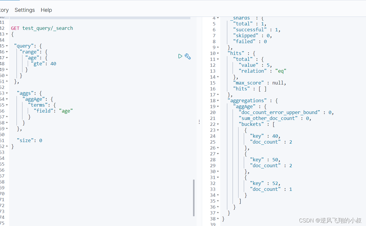 {"query": {"range": {"age": {"gte": 40}}}, "aggs": {"aggAge": {"terms": {"field": "age"}}},"size": 0