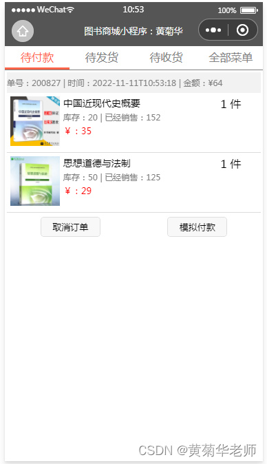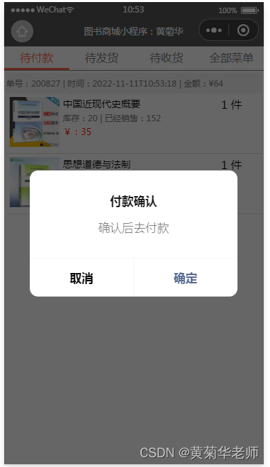 去付款::在“我的订单”列表中,点击“去付款”,模拟付款
