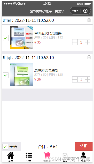 图书购物车:列出打算下单的图书列表,支持数量增加和减小