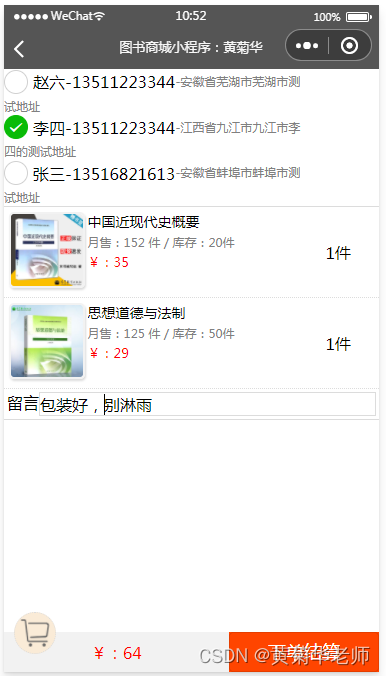 外卖下单:在购物车列表点击“去结算”,选择或者填写收货地址、确认要下单的图书和数量;填写备注。点击“下单结算”,然后跳转到订单列表