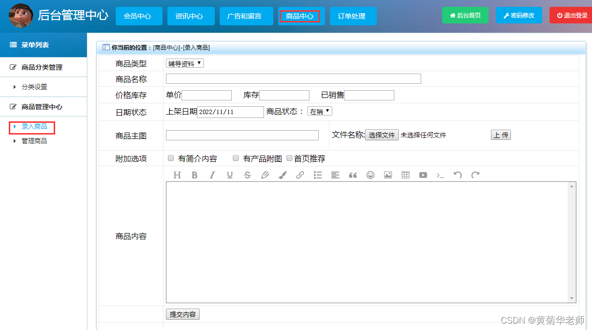 图书录入:选择图书分类、录入图书名称、库存、已销售、价格、上传图书图片、填写图书介绍