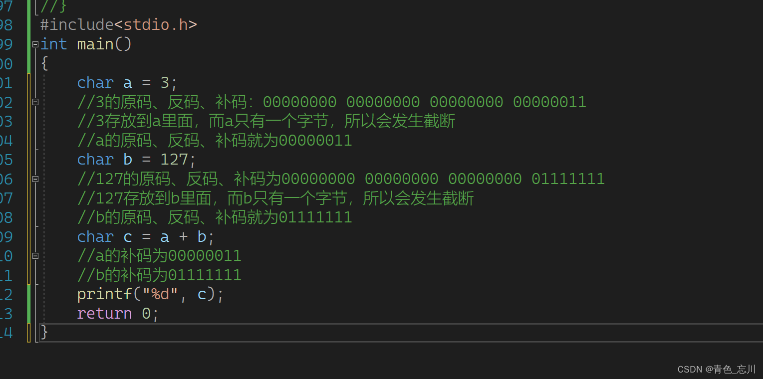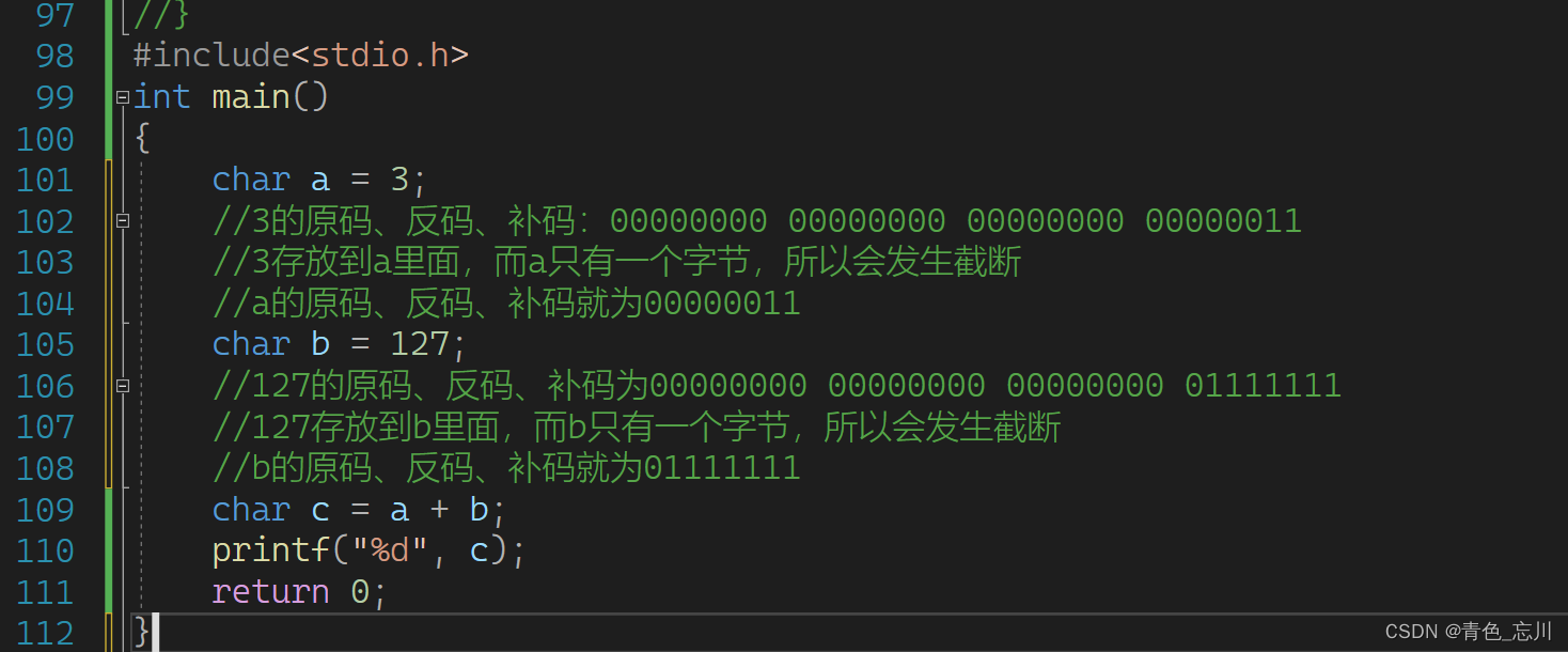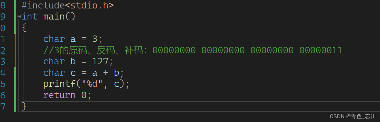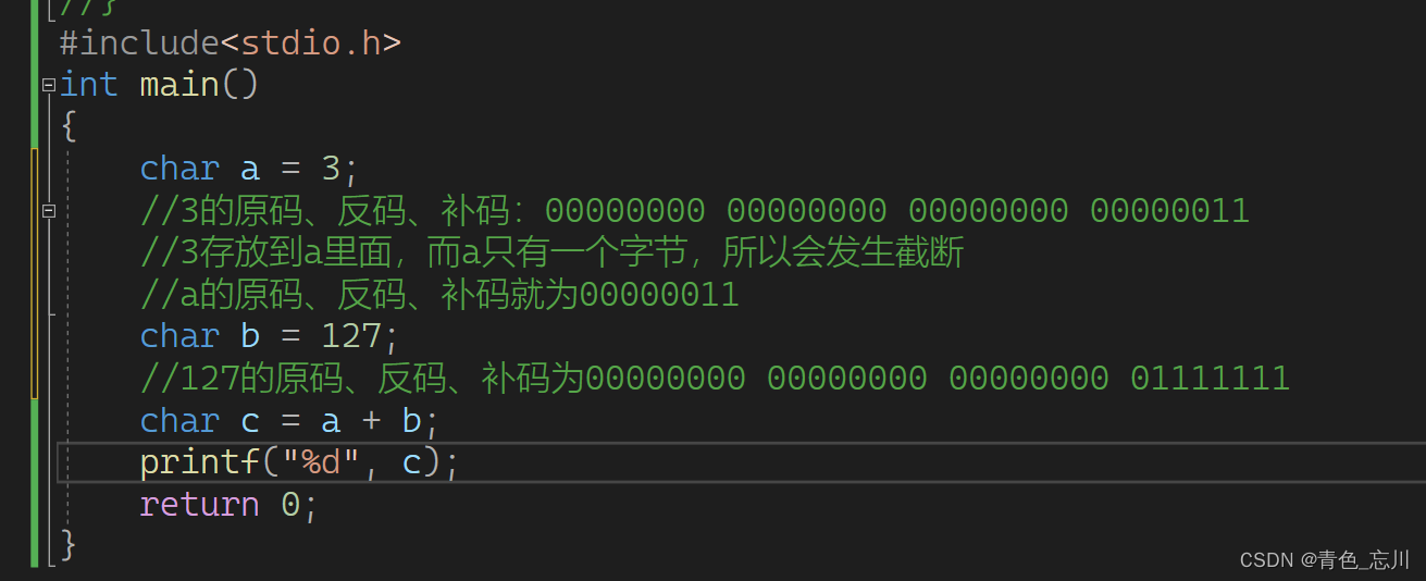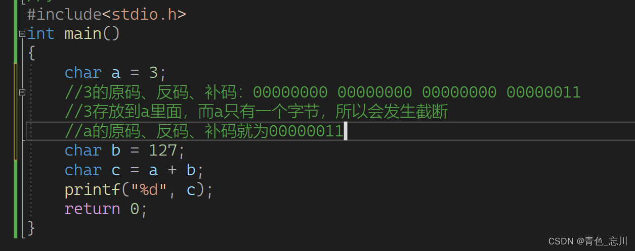 {char a = 3;char b = 127;char c = a + b;printf("%d", c);return 0;