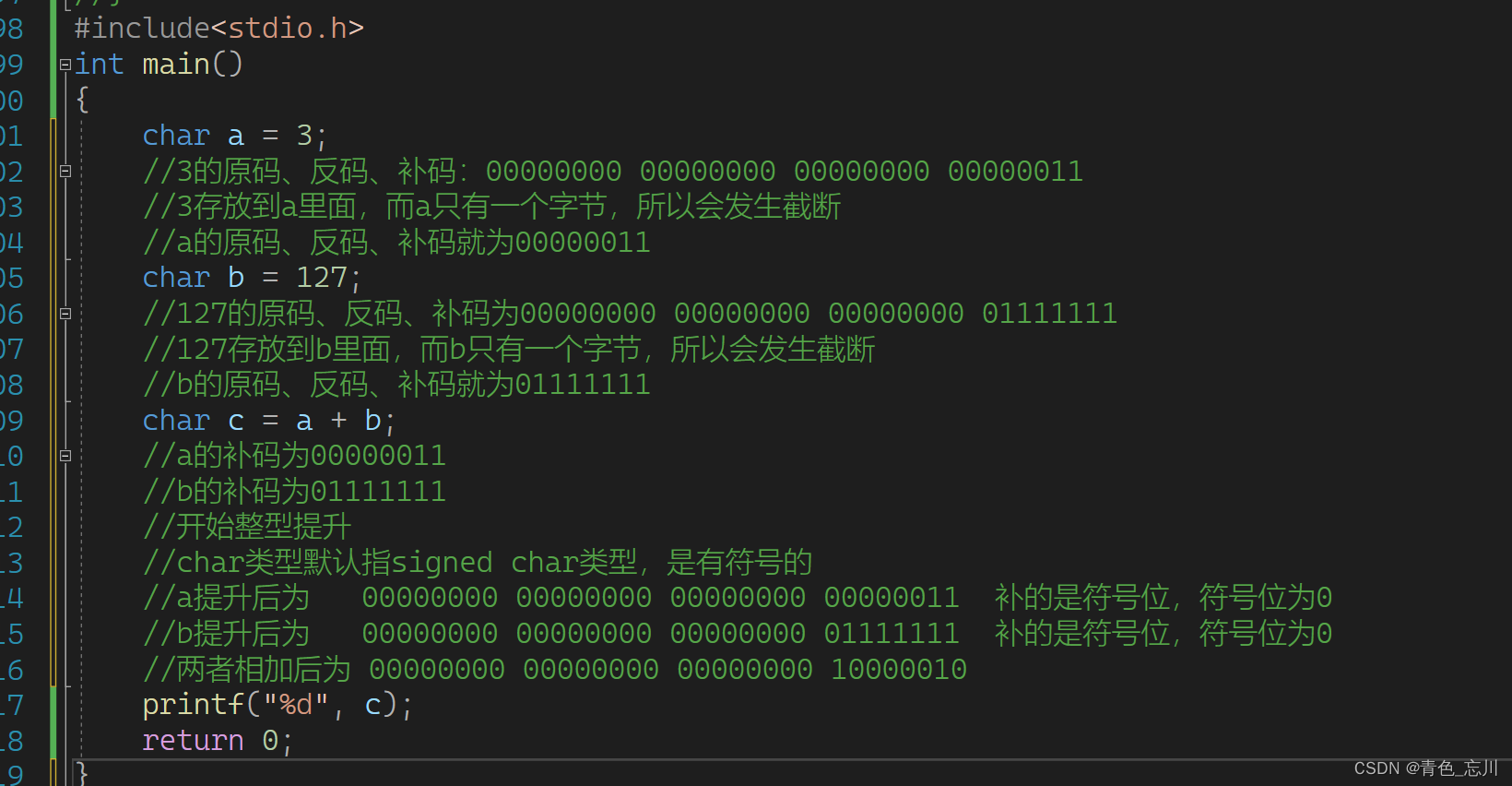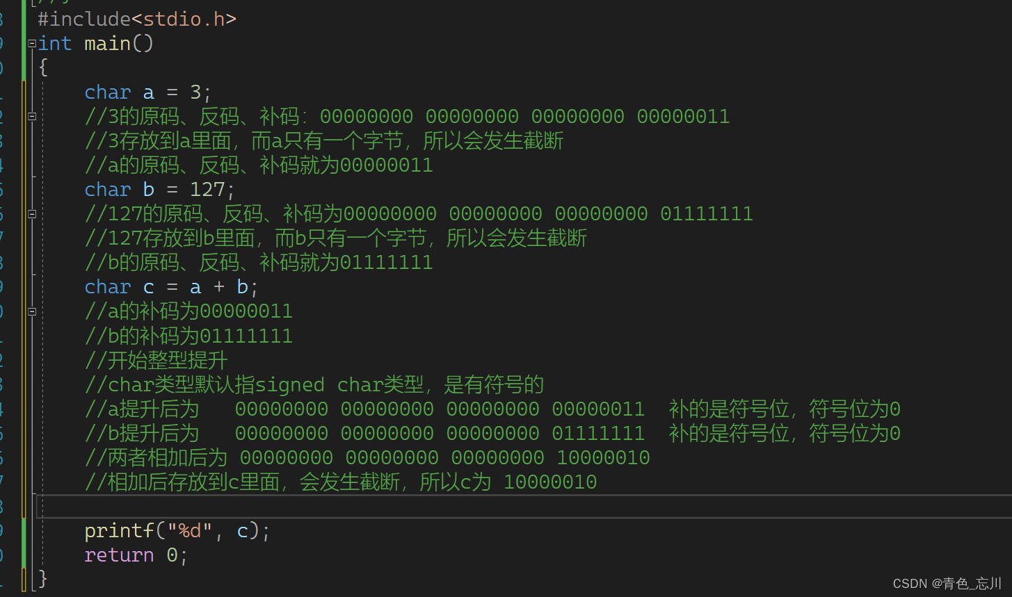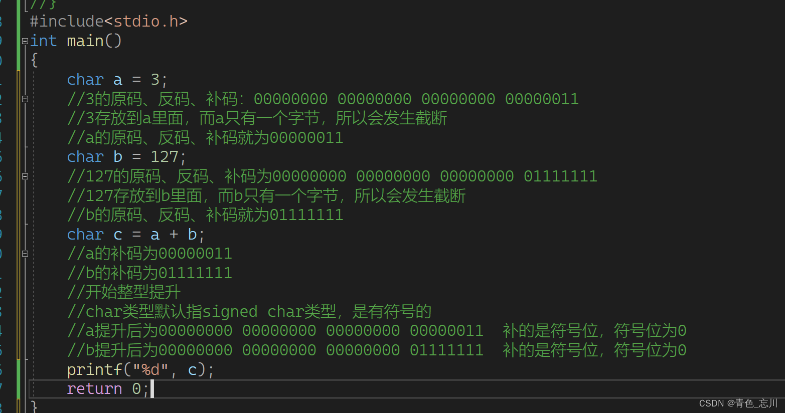 由于我们总是以缺省整型类型的精度来进行计算的,所以我们这个char类型的数据在运算的时候会先转化为int类型。然后在进行计算,这就是整型提升