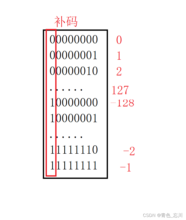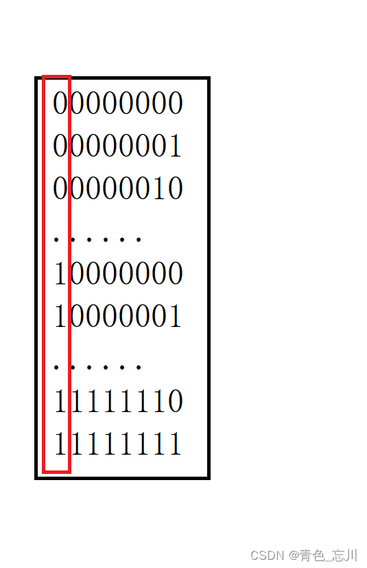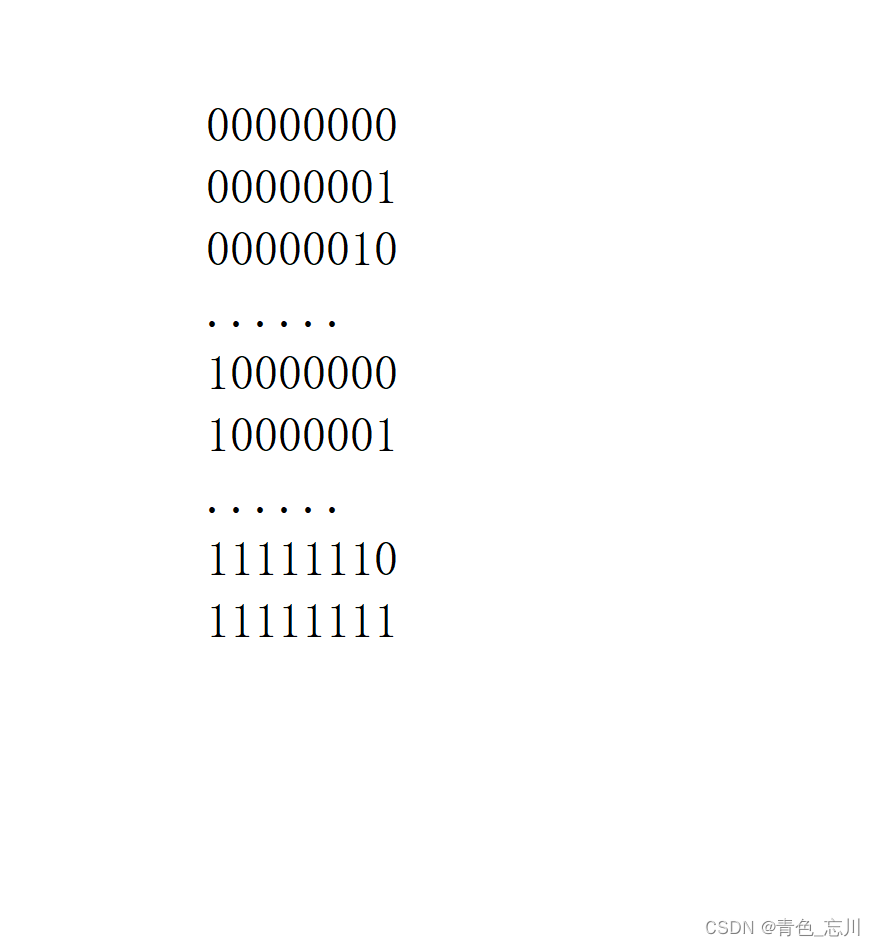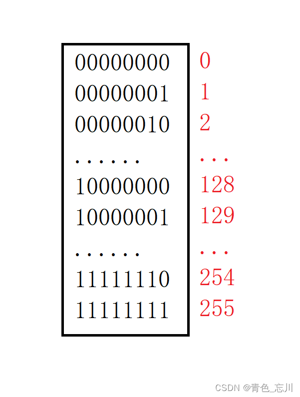 因为一个char类型是一个字节,也就是八个比特位,因此他的二进制序列的可能性就下面图中所示的这些,而这些总共有256种可能性