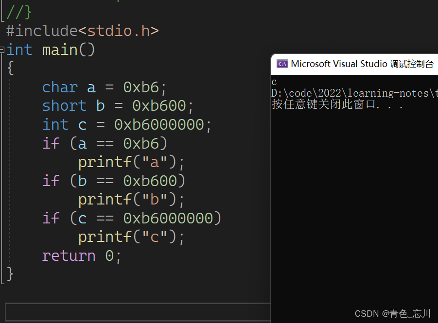 {char a = 0xb6;short b = 0xb600;int c = 0xb6000000;if (a == 0xb6)printf("a");if (b == 0xb600)printf("b");if (c == 0xb6000000)printf("c");return 0;