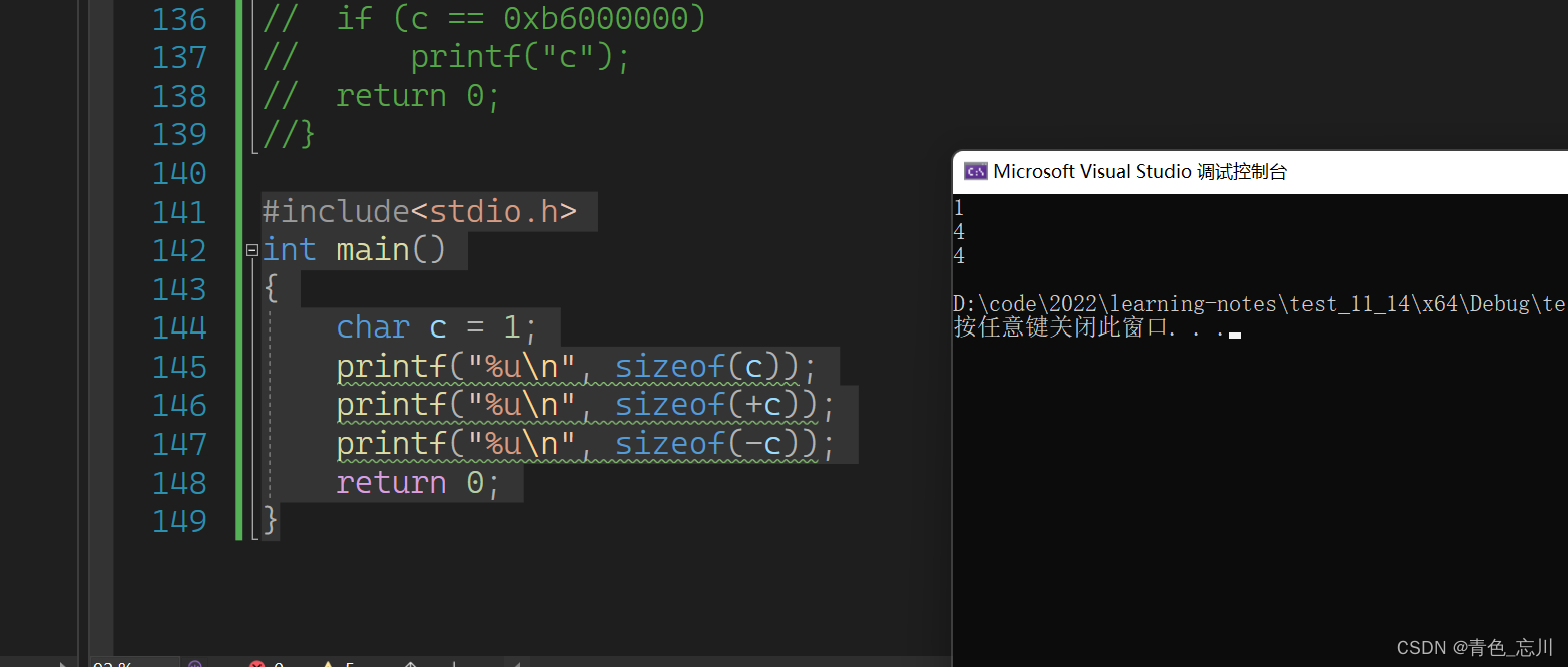 这是因为c进行了运算,所以被提升了。因为+,-也是一个操作符。