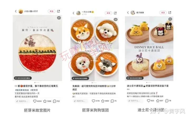 例子2:牧禾农场合作达人笔记,用胚芽米做成的故宫、超可爱狗狗饭团,迪士尼卡通饭团,这些通过将熟悉的东西陌生化,激发用户好奇心。