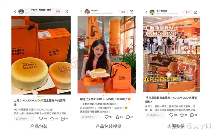 如芝士蛋糕KUMOKUMO,在传播主体落在KUMOKUMO产品形态和爱马仕包装上,橙黄色的包装和装修设计,更容易在用户心智中留下记忆点。