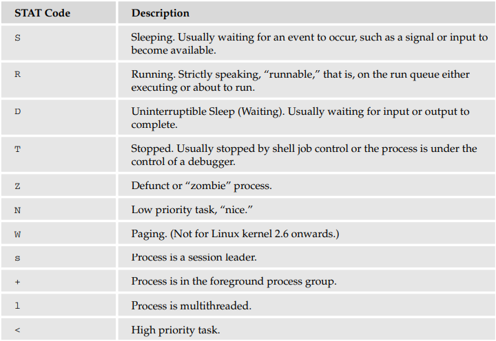 下面是在另一个 Linux 系统上运行的一些进程。为了清晰起见,已对输出进行了缩写。在以下示例中,我们将看到如何查看进程的状态。ps 的 STAT 输出提供了指示当前状态的代码。常用代码如下表所示。其中一些的含义在后面会变得更清楚。