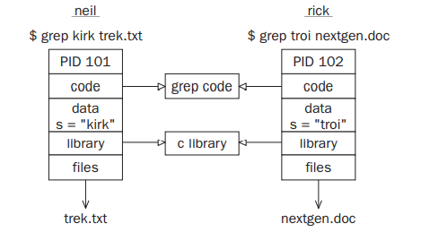 迟点我们再回来讨论 init。在这里,我们可以看到 neil 和 rick 启动的两个进程被分配了标识符 101 和 102。将由 grep 命令执行的程序代码存储在磁盘文件中。通常,Linux 进程不能写入用于保存程序代码的内存区域,因此代码以只读的形式加载到内存中。