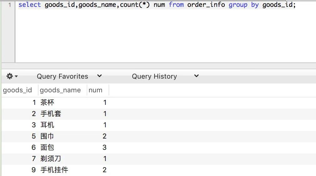 select goods_name, count(*) as numfrom order_infogroup by goods_name