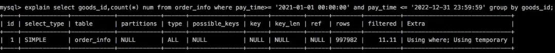 上面说了就算建立了 pay_time,goods_id 组合索引,对于 goods_id 分组依然不走索引的。