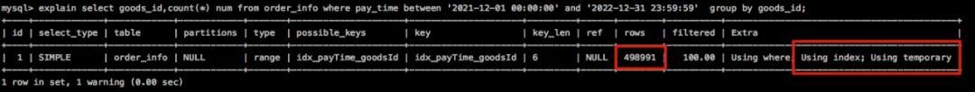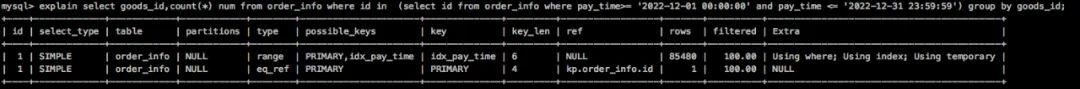 因为 pay_time 是范围查询,索引 goods_id 无效,所以分组一样有临时表存在!