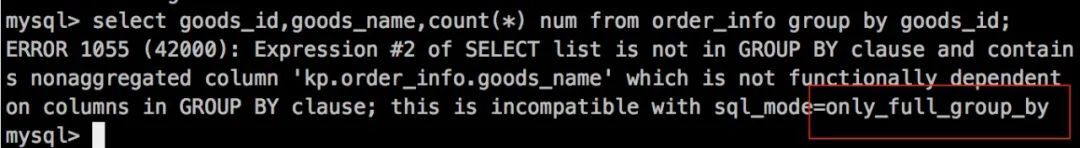 上面我们想根据商品 id 进行分组,统计每个商品的订单数量,但是我们分组只根据 goods_id 分组,但在查询列的时候,既要返回 goods_id,也要返回 goods_name。