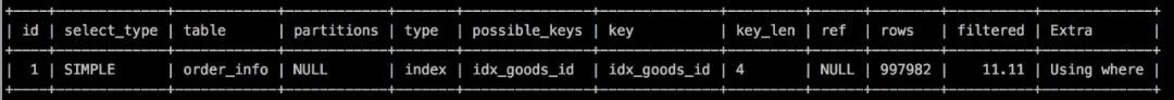 虽然说我们用到了idx_goods_id 索引,那我们看上图执行计划中 rows = 997982,说明啥,说明虽然走了索引,但是从扫描数据来看依然是全表扫描呢,为什么会这样?