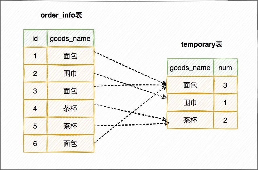「创建内存临时表」,表里面有两个字段:goods_name 和 num;
