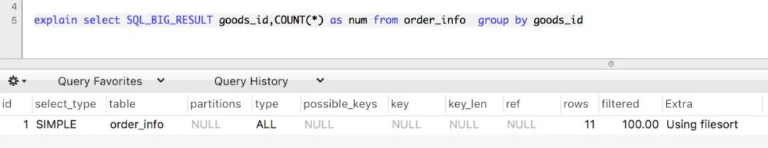 explain select sql_big_result goods_id, count(*) as numfrom order_infogroup by goods_id
