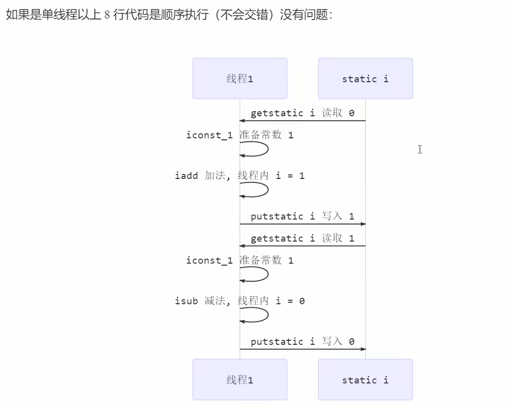 对于单线程条件下,不会出现指令交错的情况,都是一步一步按照代码的顺序执行,指令之间不会出现交错,所以计算的结果是我们所预期的那样
