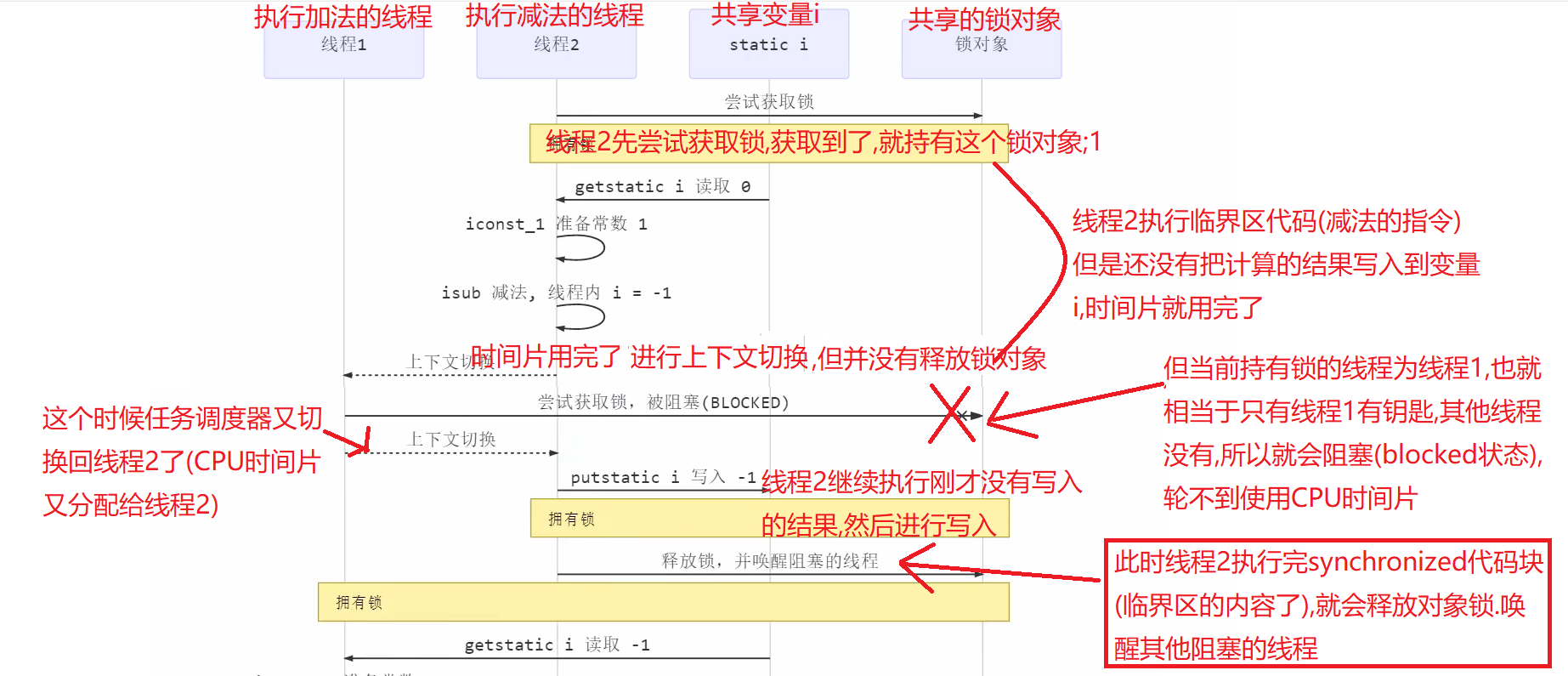 synchronized又称为对象锁,它是采用互斥的方式能够在同一时刻只能有一个线程持有[对象锁],其他线程在想获取这个[对象锁]时候就会阻塞(进入阻塞状态),这样就能够保证拥有锁的线程就可以安全的执行临界区的代码.-->不用在关心线程的上下文切换.