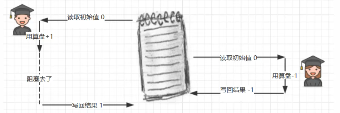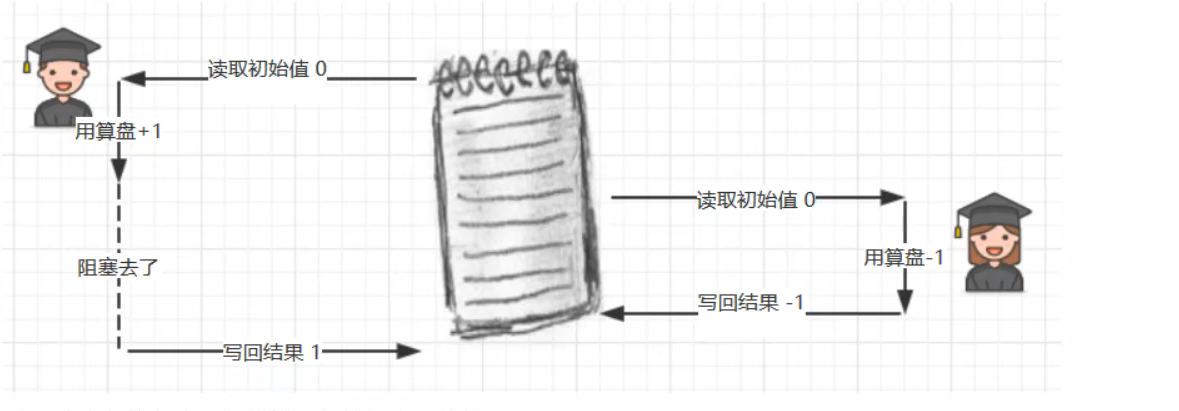 比如 小明用了一会算盘刚算出结果,就是要+1,但是还没有写到笔记本中,老王就会给他说,你的时间到了(CPU时间片用光了),于是就给小红进行计算,从笔记本拿到值为0,小红计算的是要将其结果-1,所以为0-1=-1,于是将-1写到笔记本中,小红写到笔记本之后,小红就算完了,老王就会让小明继续算,小明刚才算出来了于是就把写过写到笔记本上,现在最终结果为1.