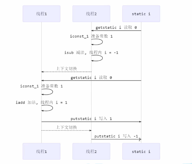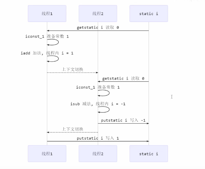 线程1取静态变量,值为0,然后准备常数1,然后对i做++操作,i变为1,但是还没有把结果写入到变量i中,这个时候CPU时间片用完了,进行线程上下文切换,切换到线程2,然后线程2也是按照指令进行执行从静态变量中读取,读取的是0,然后准备常数1,在执行自减操作i变为-1,写入到i变量中,这时线程2执行完了,又进行线程的上下文切换,然后线程1接着刚才没有执行的操作继续执行,于是将其1写入到变量i中.最终i的值不是我们预期的0,而是1--->出现正数情况