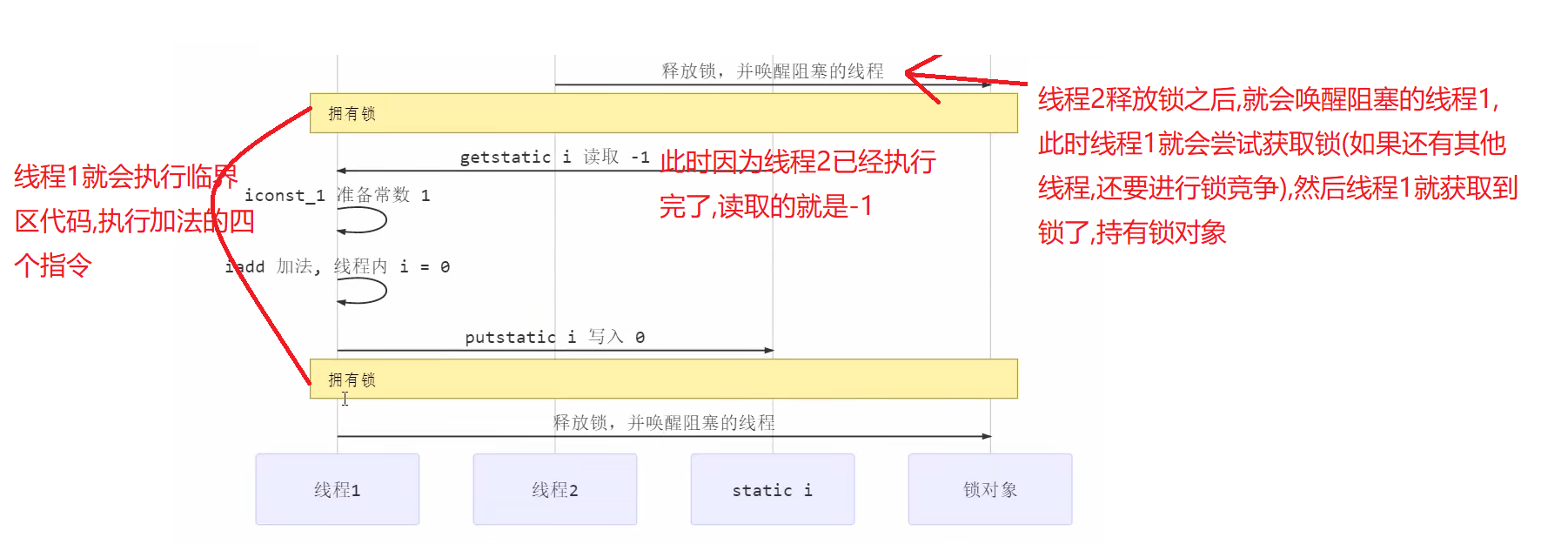 比如现在有两个线程(线程1,线程2)来竞争锁,比如线程1先获取到对象锁(锁的持有者),线程2没有获取到这个对象锁只能阻塞等待(阻塞状态->blocked状态,因为同一时刻只能有一个线程持有对象锁),当线程1执行完临界区的代码->执行完synchronized代码块了,线程1就会释放该对象锁,同时唤醒线程2(唤醒阻塞状态的线程,从blocked状态->可运行的状态). 再由线程2来执行临界区的代码
