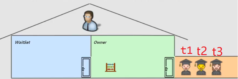 我们可以将这个synchronized(对象),这个线程共享的对象看做是一个房间,这个房间一次只能有一个人进入(持有对象锁),其他人只能在门外等着(运行状态->阻塞状态),可以把门外的三个人想象成3个线程.